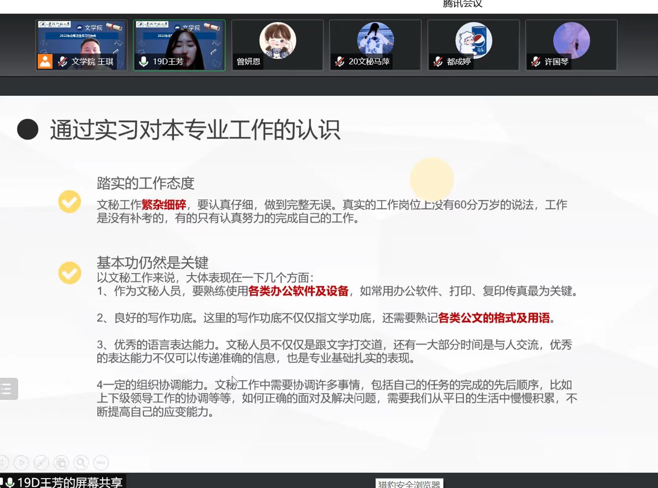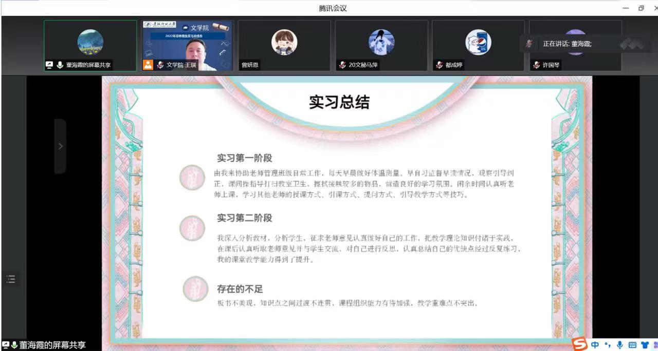 2022年6月23日晚19时,开云体育官网 汉语言文学(行政文秘)专业线上召开了汉语言文学(行政文秘方向)2019级实习总结会暨2020级实习动员大会,2019级及2020级文秘专业学生80余人参加,会议由开云体育 非师范生实习指导教师王琪老师组织,大会议程共三项。