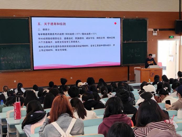 在学风建设方面,鼓励同学们积极提交优秀书评,作品由学习委员收集、班主任筛选后,可择优推荐进行发表,以此提升自身专业实践能力。在集体活动方面,明确“省长杯”足球赛、校园运动会、迷你马拉松等活动安排,核定了参与名额并落实德育加分等细则,保证活动有序推进。在德育与综测部分,袁老师详细说明了综合测评(德智体美劳)构成、德育分计算方式及申报流程,要求同学们高度重视。