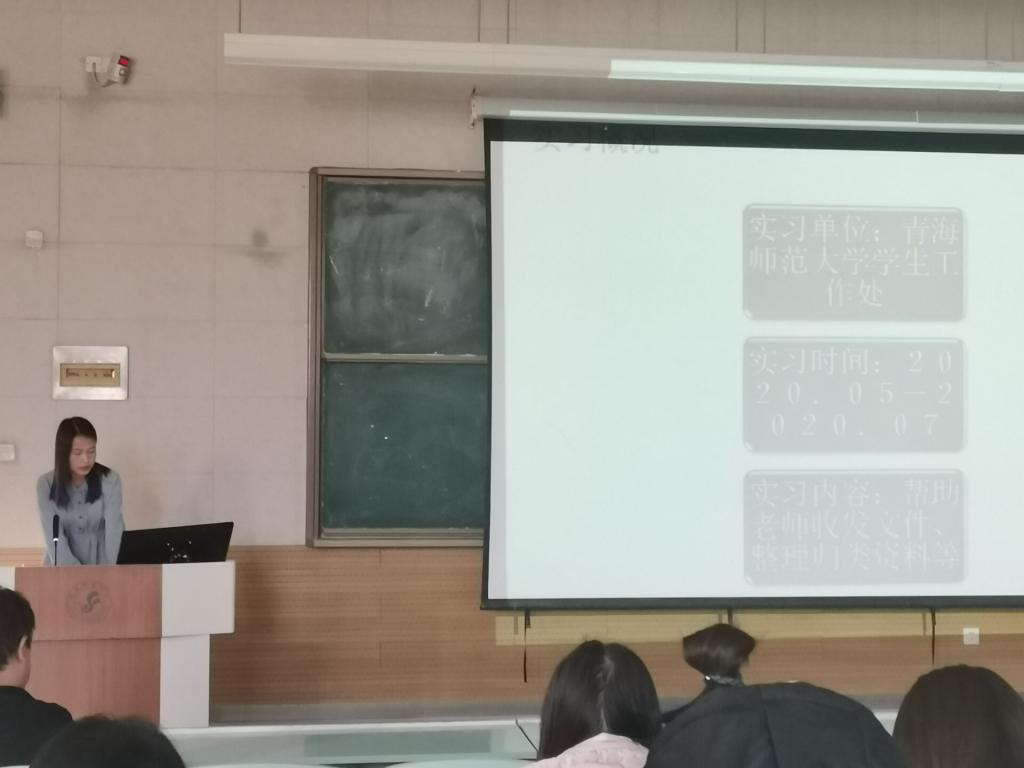 第二项由2017级优秀实习生杜文娟、顾智青、吴迪、韩琴、张琳五位同学与2018级同学分享实习过程中的总结与收获。杜文娟同学的实习单位是青海师范大学教务处实践科(顶岗支教办),主要工作内容是师范生与非师范生实习工作等;顾智青同学的实习单位是青海师范大学学生工作处,主要工作内容是帮助老师收发整理文件档案及宿舍检查等;吴迪同学的实习单位是青海师范大学历史开云体育