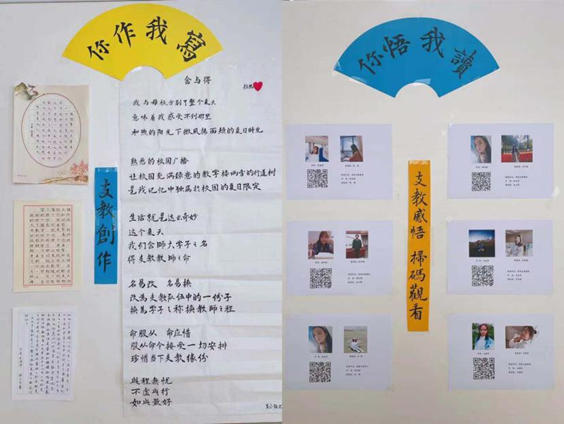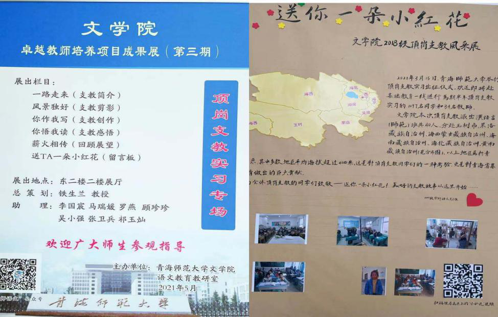 “青师语文杯”卓越教师培养项目成果展,5月以“顶岗支教实习专场”为主题,举办了一期卓越教师项目成果展,主要设有“一路走来”(支教简介)、“风景独好”(支教剪影)、“你作我写”(支教创作)、“你悟我读”(支教感悟)、“薪火相传”(回顾展望)、“送TA一朵小红花”(留言板)六个栏目展出。