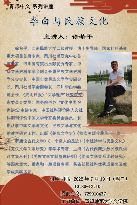 徐希平,西南民族大学二级教授,博士生导师,国家社科基金重大项目首席专家,四川杜甫研究中心首席专家,四川省有突出贡献优秀专家。中华文学史料学学会副会长暨民族文学史料学分会会长;中国少数民族文学学会副会长;四川杜甫学会副会长;四川李白学会副会长;《光明日报》“文学遗产”研究院专家委员会委员;国务院侨办文化中国·名家讲坛主讲专家;中国社科评价院人文社科期刊评价中国文学专家委员会委员;长期从事中国文学与文化,民族文学与文化的教学研究工作。出版《羌族文学史》《笳吹弦颂传薪录——闻一多、罗庸论古代文学》《一个彝人的足迹》《李杜诗学与民族文化》《羌汉文学关系研究》等学术专著,主持《古代西南少数民族汉语诗文集丛刊》《羌族文学文献整理研究》《羌汉文学关系比较研究》等国家重大、重点和一般项目多项,获省部级社科优秀成果奖及教学成果奖多项。