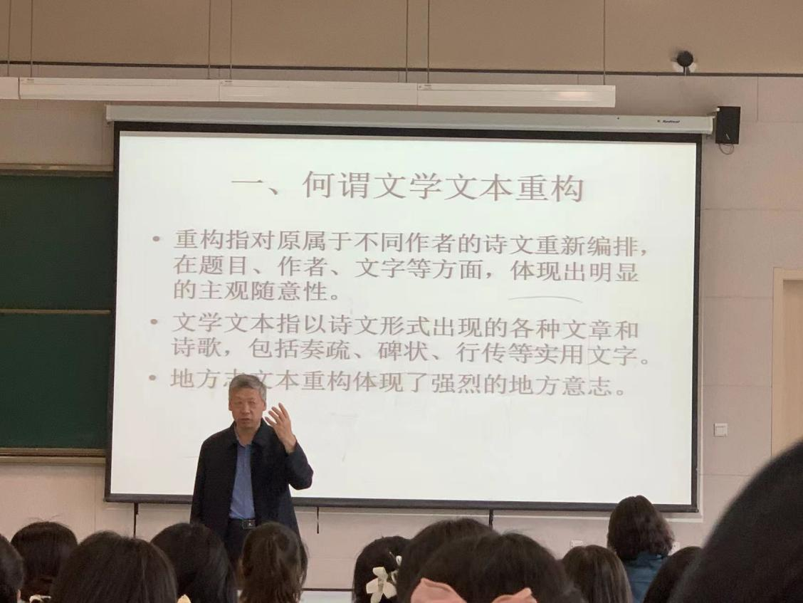 最后,张教授表示,地方志的重构对我们当代具有重要启示,它让我们进一步认识到文本异文以及版本如何产生差异的问题,让同学们从更加客观的角度理解何谓真本、原本、善本,以及读者因素如何促进文本异文的程度和广度,也提醒同学们要从辩证的角度全面的看待地方志中的经典诗文。