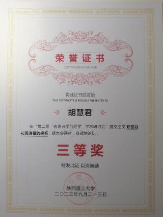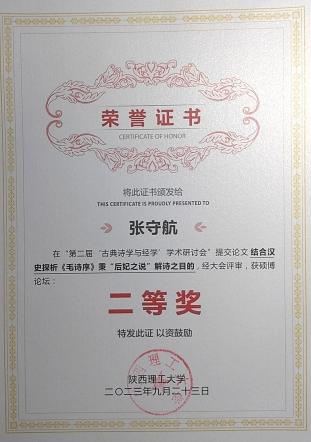 此次研讨会共有43位硕博生参会,其中硕士23位,博士20位,论文奖项共分为三等,一等奖4人,二等奖6人,三等奖10人,其中,硕士获奖论文共计7篇。张守航同学的论文《结合汉史探析〈毛诗序〉秉“后妃之说”解诗之目的》,参稽相关史料,结合《毛诗序》的叙述,从重婚姻、立妇德、归君后三个方面,探析《毛诗序》秉“后妃之说”以解经之目的,荣获硕博优秀论文二等奖。胡慧君同学的论文《郑玄以礼说<诗>目的探析》,考镜源流,远承先秦诸子、近取汉代经学,追溯东汉经学家郑玄以礼说<诗>之学术性目的,荣获硕博优秀论文三等奖。