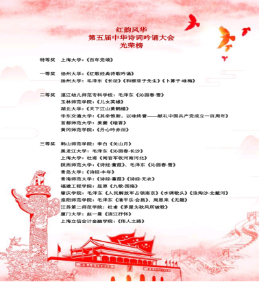 鹿鸣诗社参加了由上海大学承办的“红韵风华——第五届中华诗词吟诵大会”,评审专家有复旦大学教授蒋凡先生、《老残游记》作者的后人刘德隆先生等国内知名学者,大会由央视中华诗词大会总冠军、北京大学博士陈更主持。