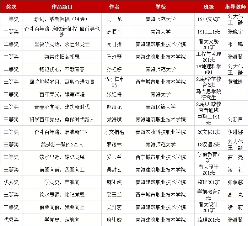 近日,由省教育厅、西海都市报社联合举办的“奋斗百年路 启航新征程——万名师生同学党史”征文大赛获奖名单揭晓,我校天风文学社成员在此次征文大赛中取得优异成绩。