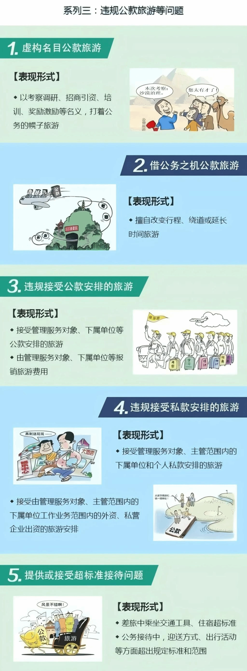 第一百一十五条 有下列行为之一,对直接责任者和领导责任者,情节较轻的,给予警告或者严重警告处分;情节较重的,给予撤销党内职务或者留党察看处分;情节严重的,给予开除党籍处分:(一)公款旅游或者以学习培训、考察调研、职工疗养等为名变相公款旅游;(二)改变公务行程,借机旅游;(三)参加所管理企业、下属单位组织的考察活动,借机旅游。以考察、学习、培训、研讨、招商、参展等名义变相用公款出国(境)旅游的,对直接责任者和领导责任者,依照前款规定处理。