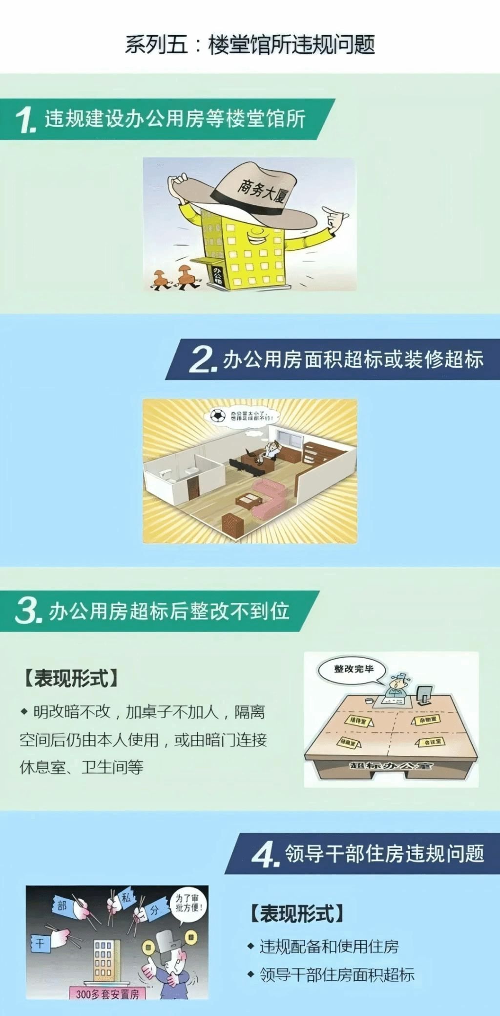 第一百一十九条 违反办公用房管理等规定,有下列行为之一,对直接责任者和领导责任者,情节较重的,给予警告或者严重警告处分;情节严重的,给予撤销党内职务处分:(一)决定或者批准兴建、装修办公楼、培训中心等楼堂馆所;(二)超标准配备、使用办公用房;(三)未经批准租用、借用办公用房;(四)用公款包租、占用客房或者其他场所供个人使用;(五)其他违反办公用房管理等规定行为。