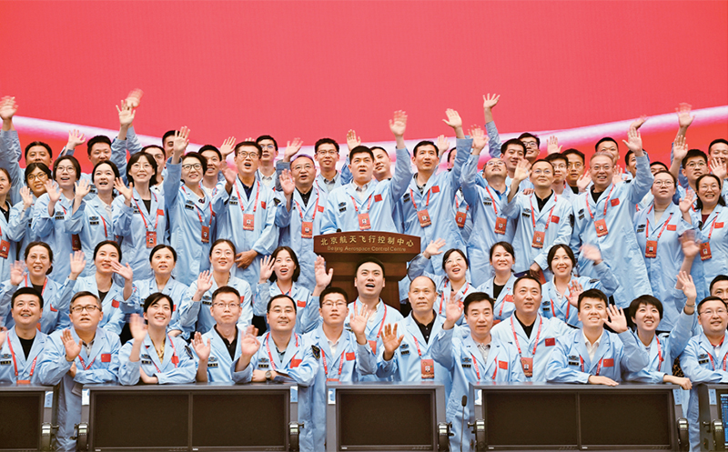 嫦娥六号完成了人类历史上首次月球背面采样,突破了多项关键技术,是我国建设航天强国、科技强国取得的又一标志性成果,是我国探月工程的重要里程碑。图为2024年6月25日,嫦娥六号任务圆满成功后,工作人员在北京航天飞行控制中心合影。
